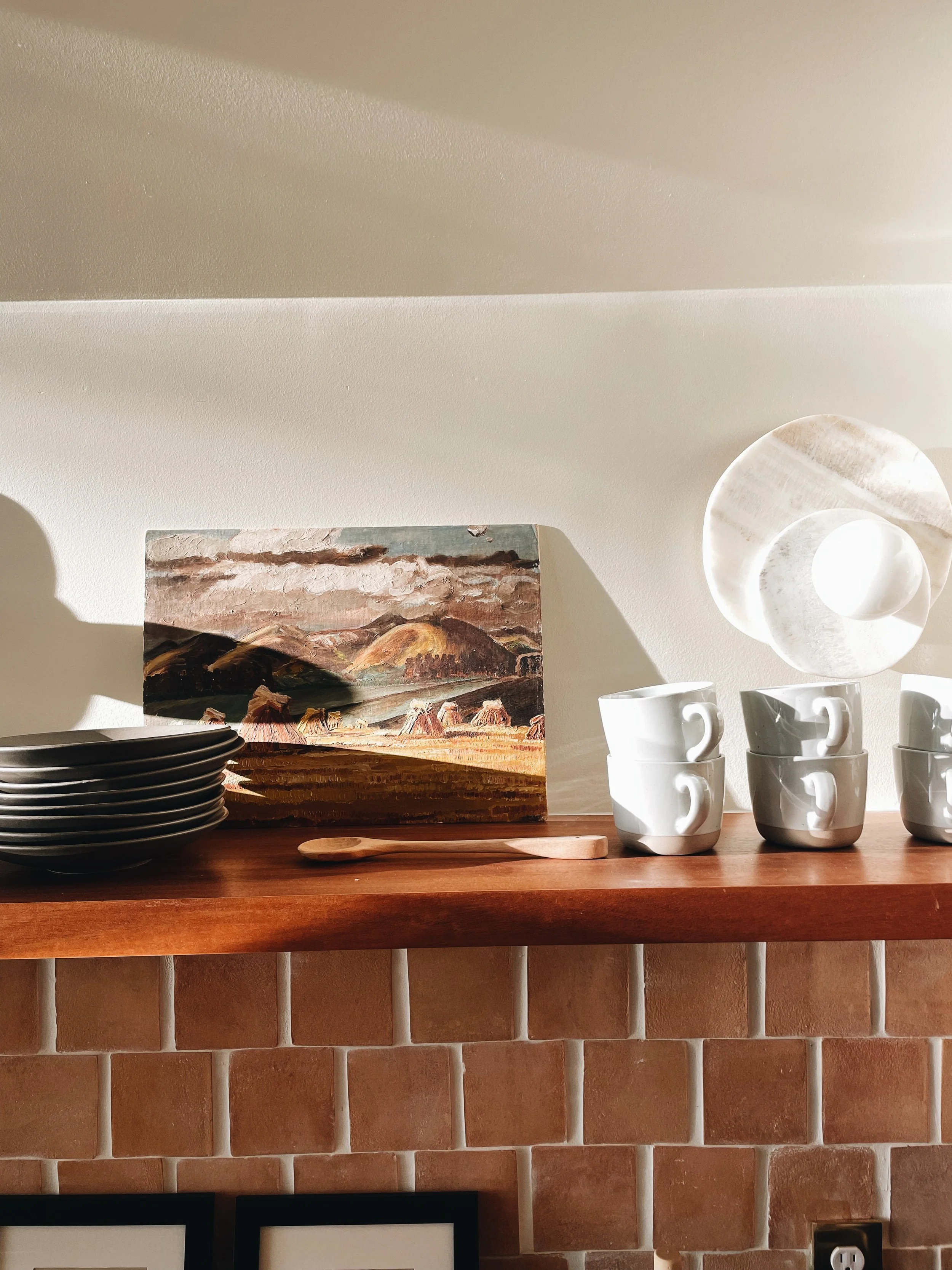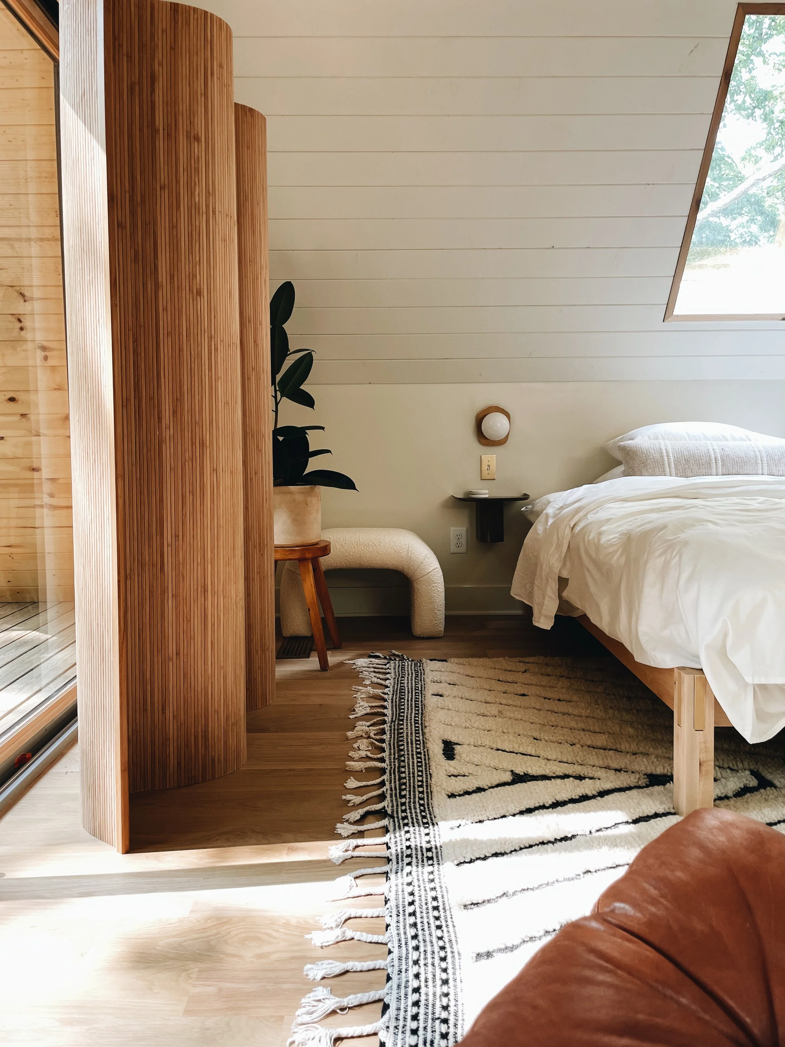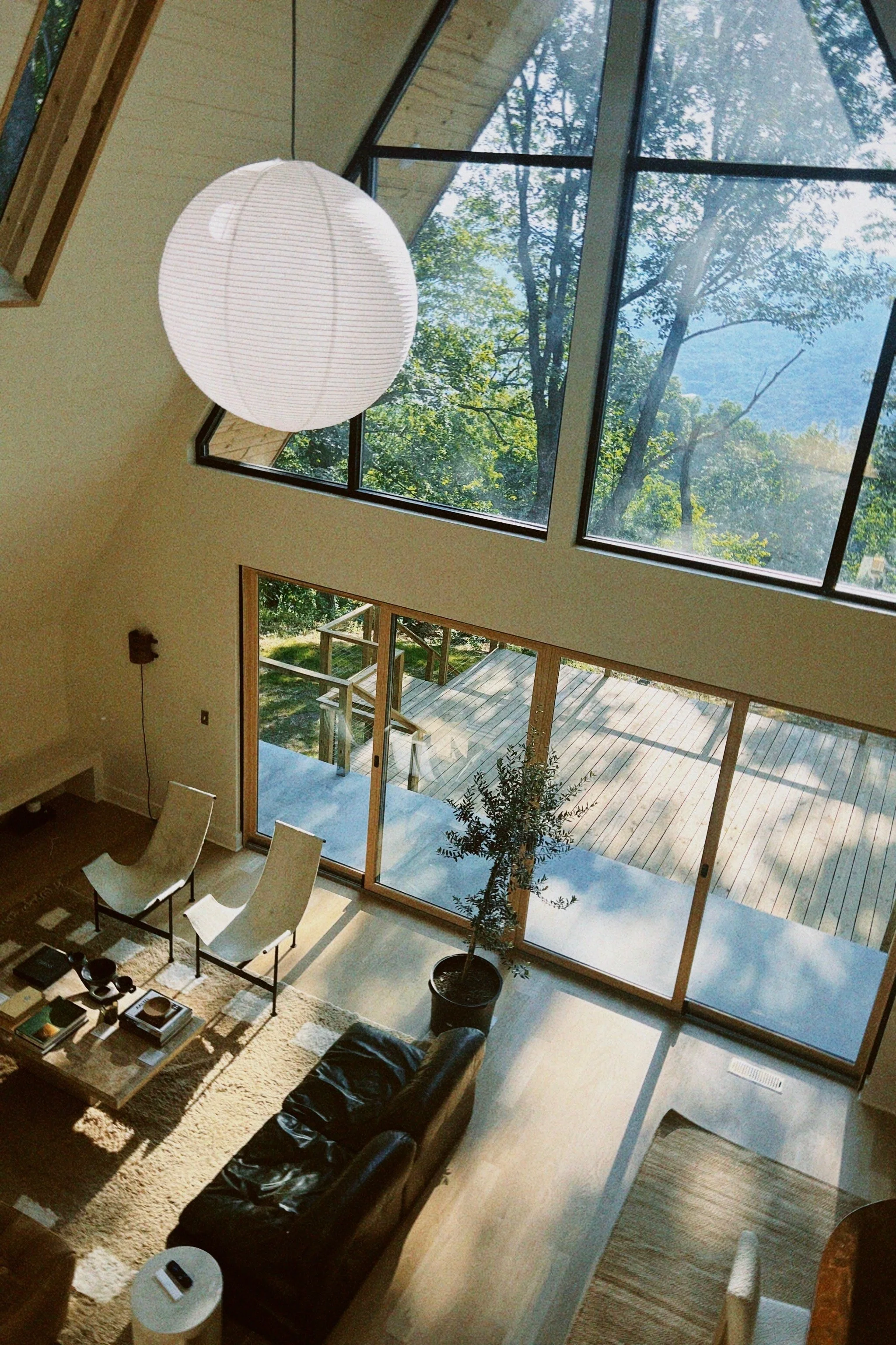 The aframe is furnished almost exclusively with designer vintage furniture. Everything else is from brands like Parachute, Flamingo Estate, The Citizenry, Fellow, and HAY. (A true millennial’s dream)
