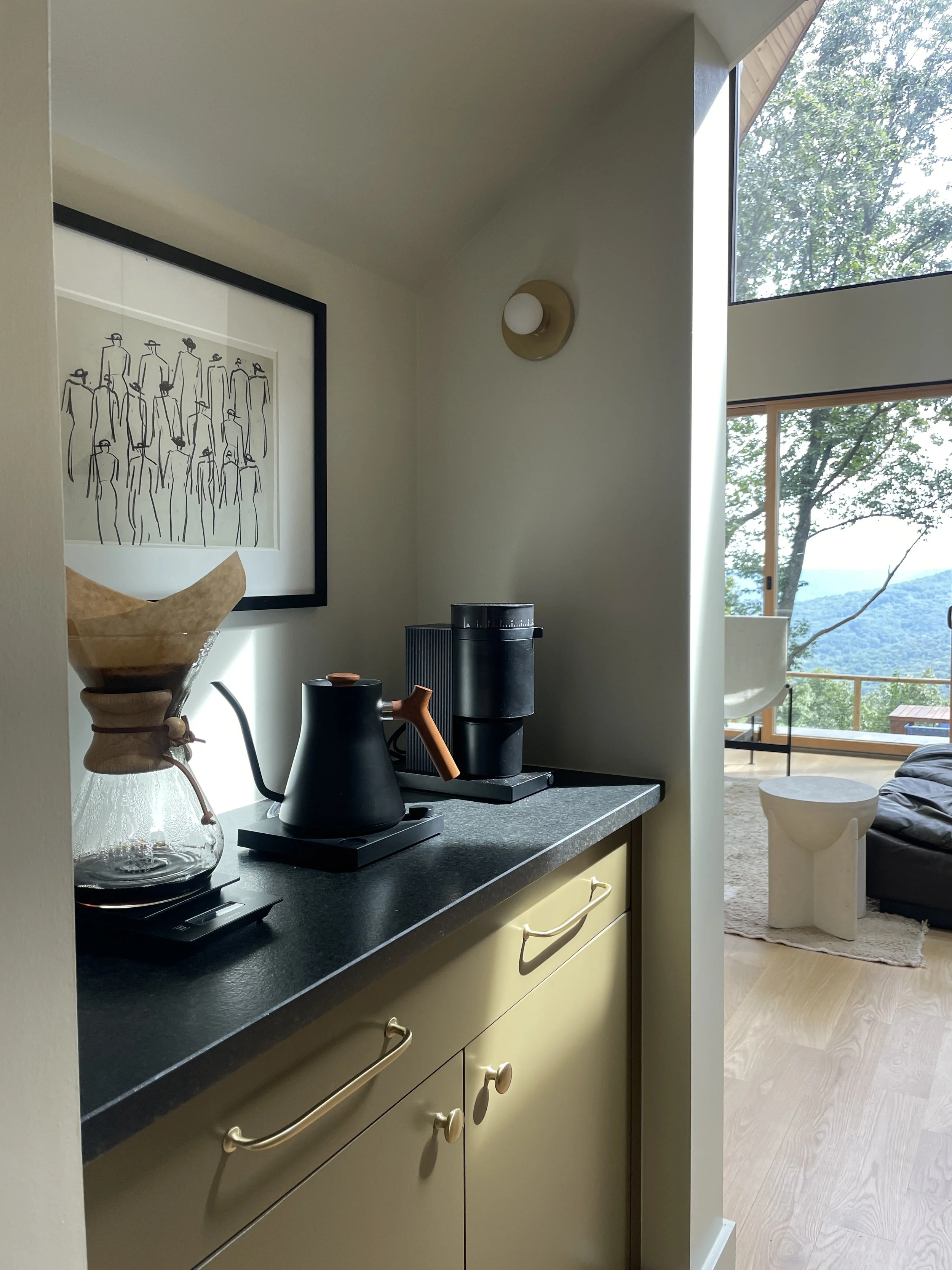 I knew from the beginning I wanted a really good coffee set up for the A. Something coffee snobs and busy families could equally enjoy. The pace of life is slower in Sewanee, so it felt right to offer a chemex pour over set up for guests to relish in the ritual of making coffee while enjoying gorgeous views. The Fellow Stagg EKG Electric Kettle and Opus Conical Burr Grinder are a match made in heaven for this. I usually stock Elegy beans but occasionally I’ll bring in Crema.